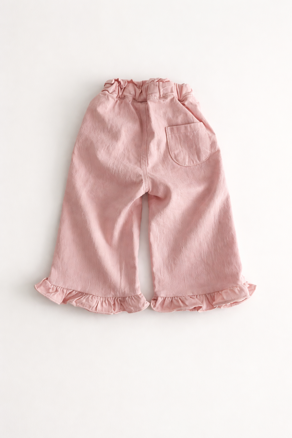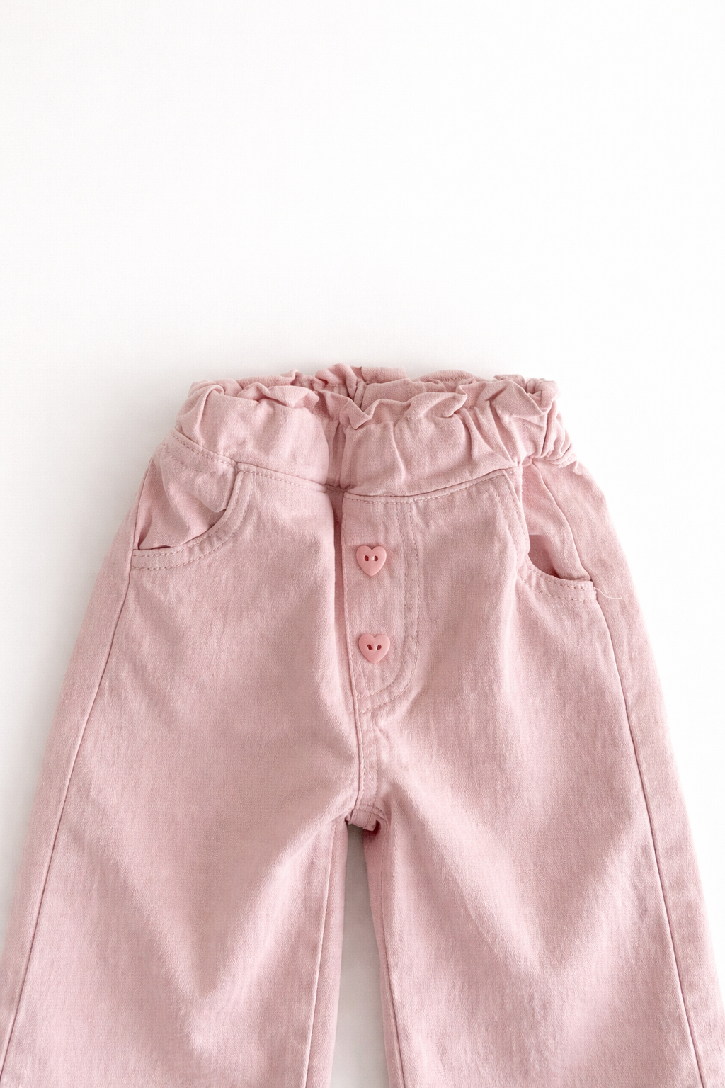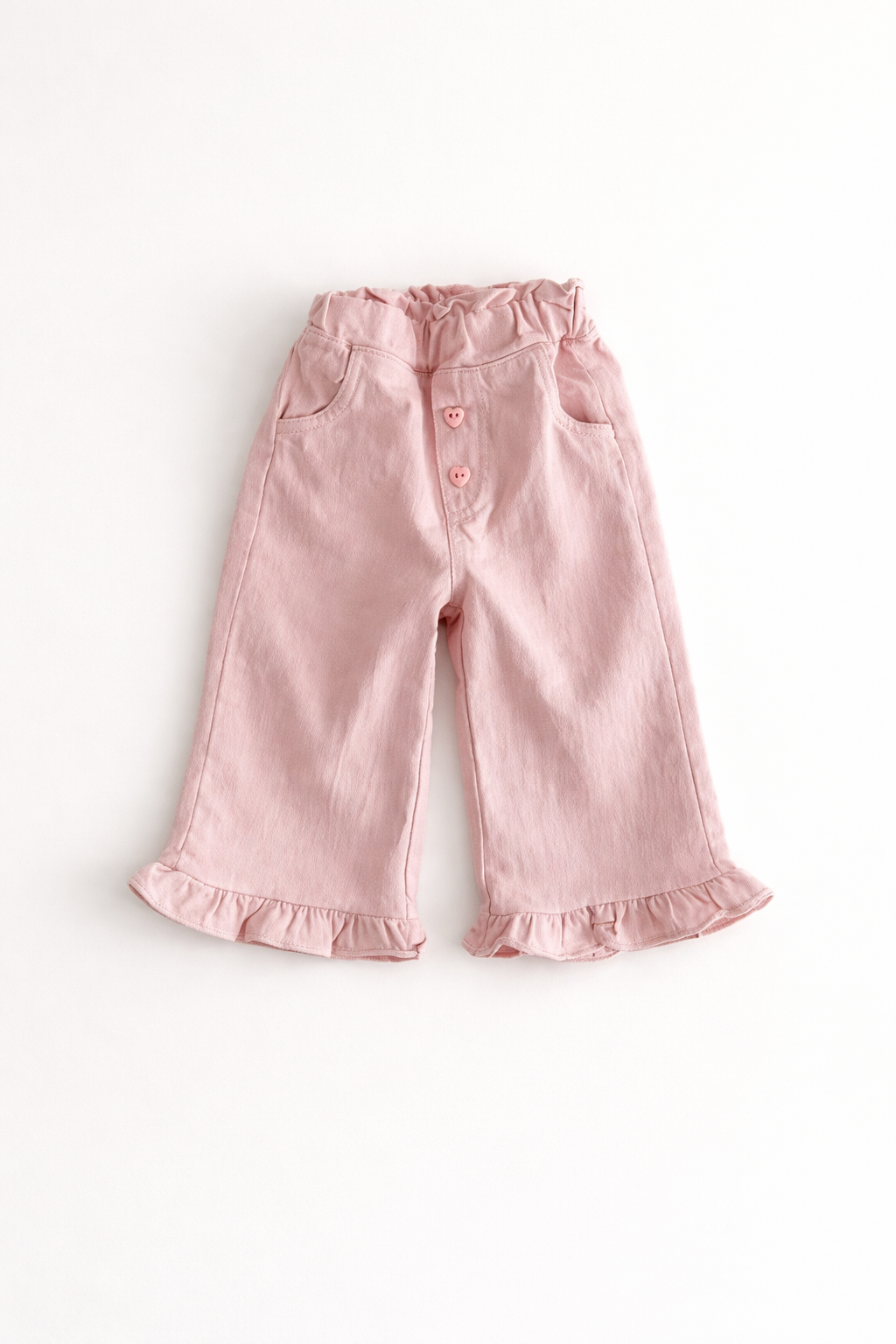 - Pantaloni cu croiala lejera din denim moale de bumbac. Cu buzunare laterale in fata si unul in spate, cu elastic imbracat, incretit in talie si doi nasturi decorativi in partea din fata. Blugi lejeri pe picioare, cu tiv incretit.