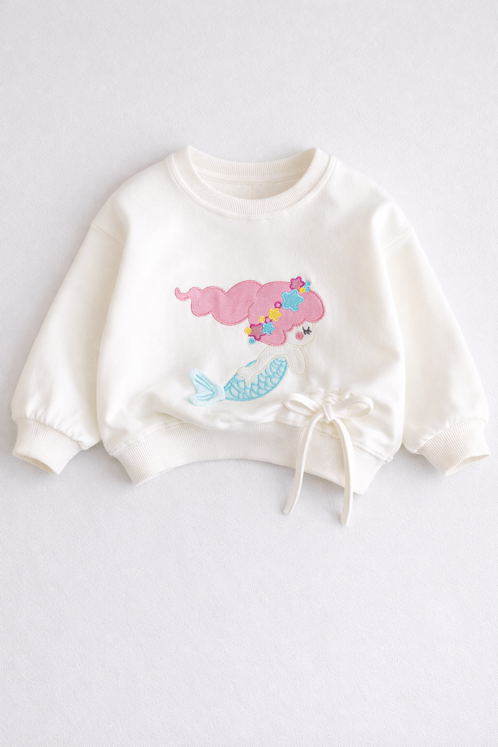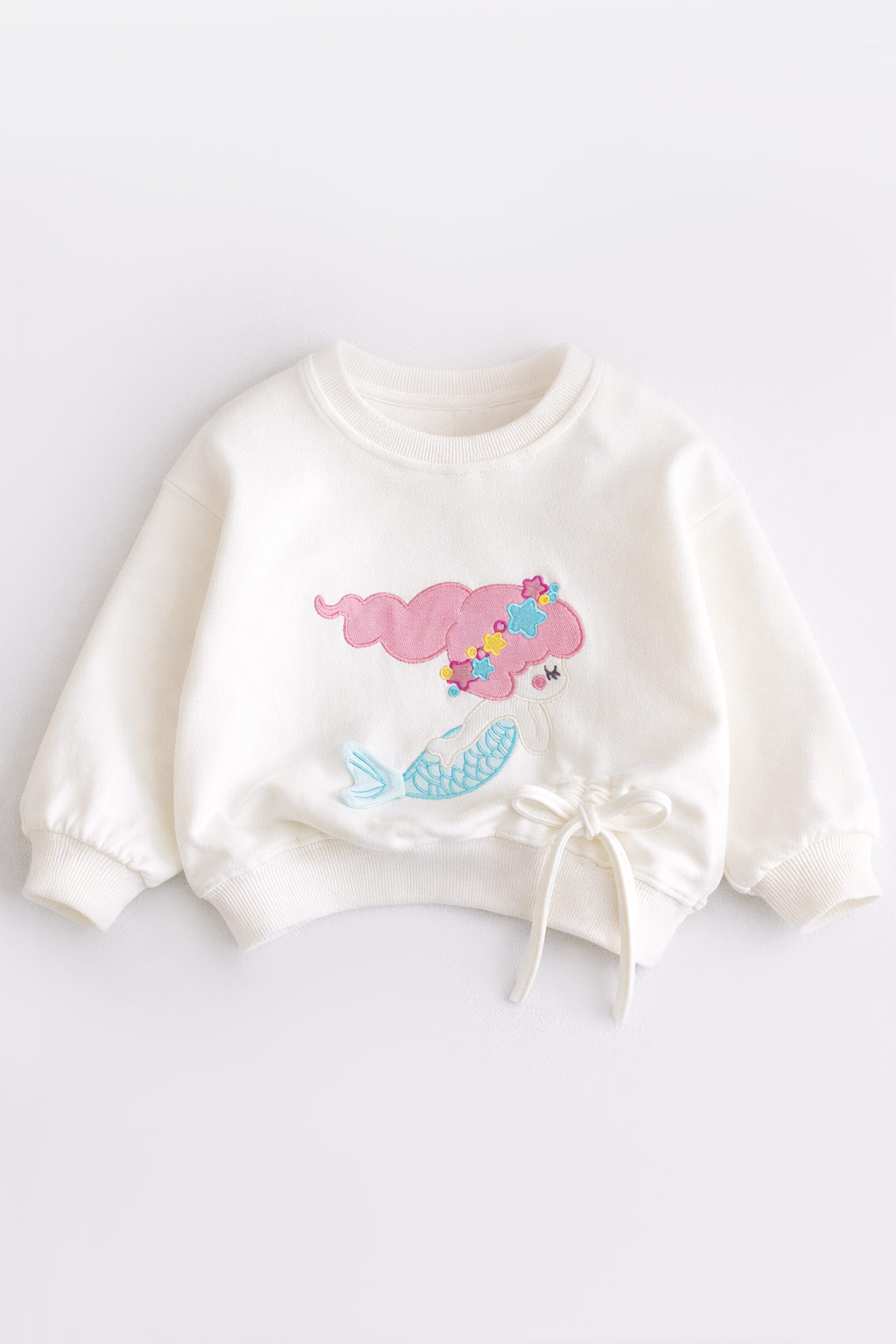 - Bluza casual cu maneci lungi, din bumbac cu textura fina. Cu snururi decorative laterale, borduri reiate la rascroiala gatului si la mansete. Cu sirena brodata in fata.