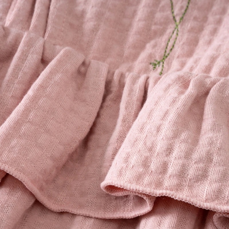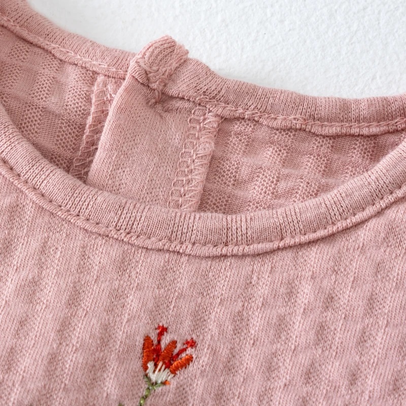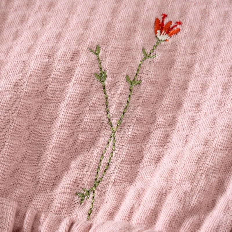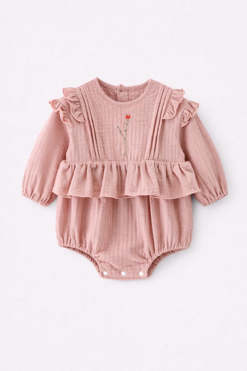 - Body roz din muselina de bumbac, cu croiala lejera si broderie florala. Cu maneci lungi, doua randuri de volane la umeri si un rand in talie. Cu detalii din dantela, capse intre picioare pentru confort sporit, nasturi la rascroiala gatului si elastic ingust la rascroiala picioarelor.