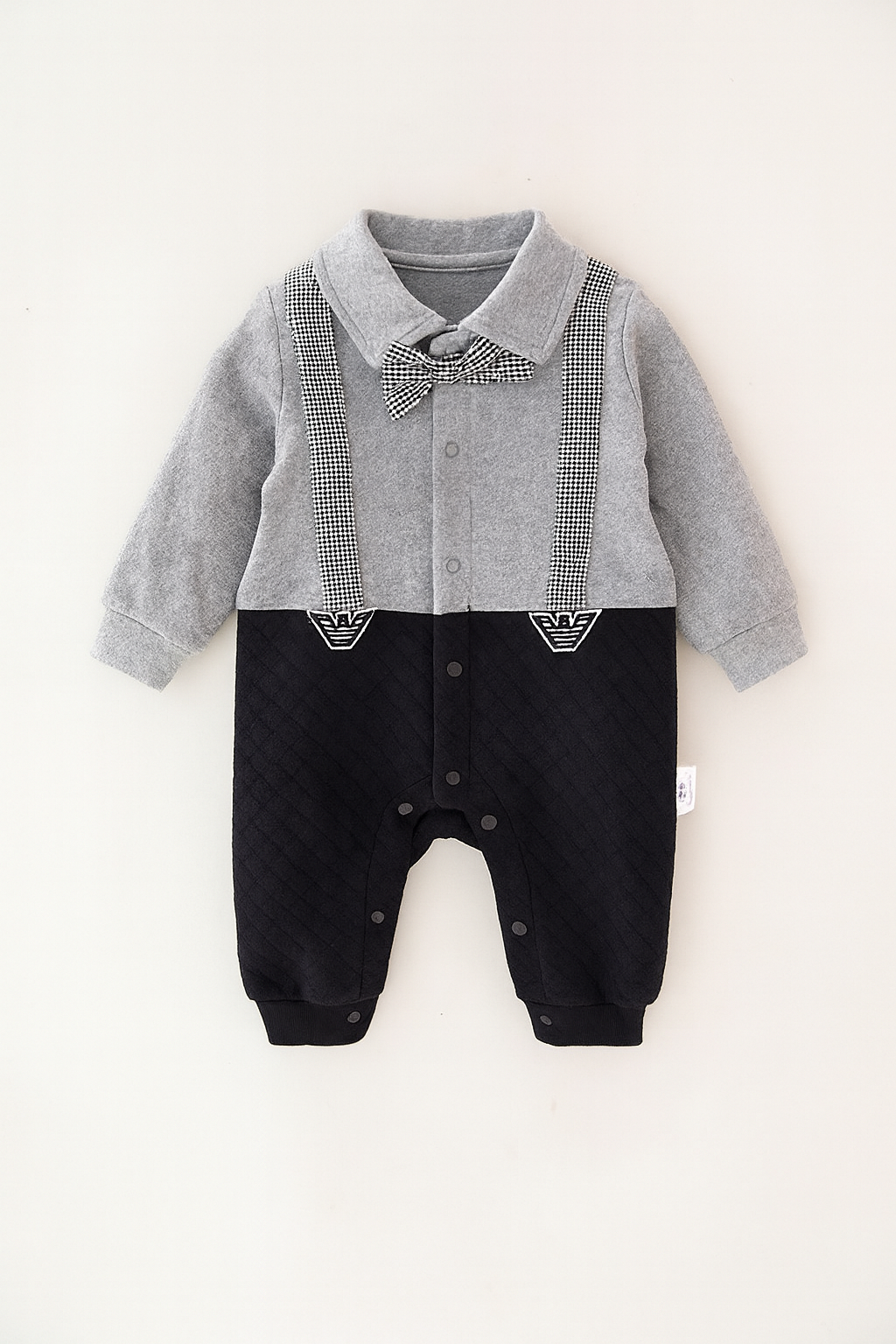 - Salopeta pentru bebelusi cu maneci lungi, dintesatura de bumbac moale, cu capse de sus pana jos si intre picioare, cu guler tip camasa si papion nedetasabil. Usor flausat in partea de sus.