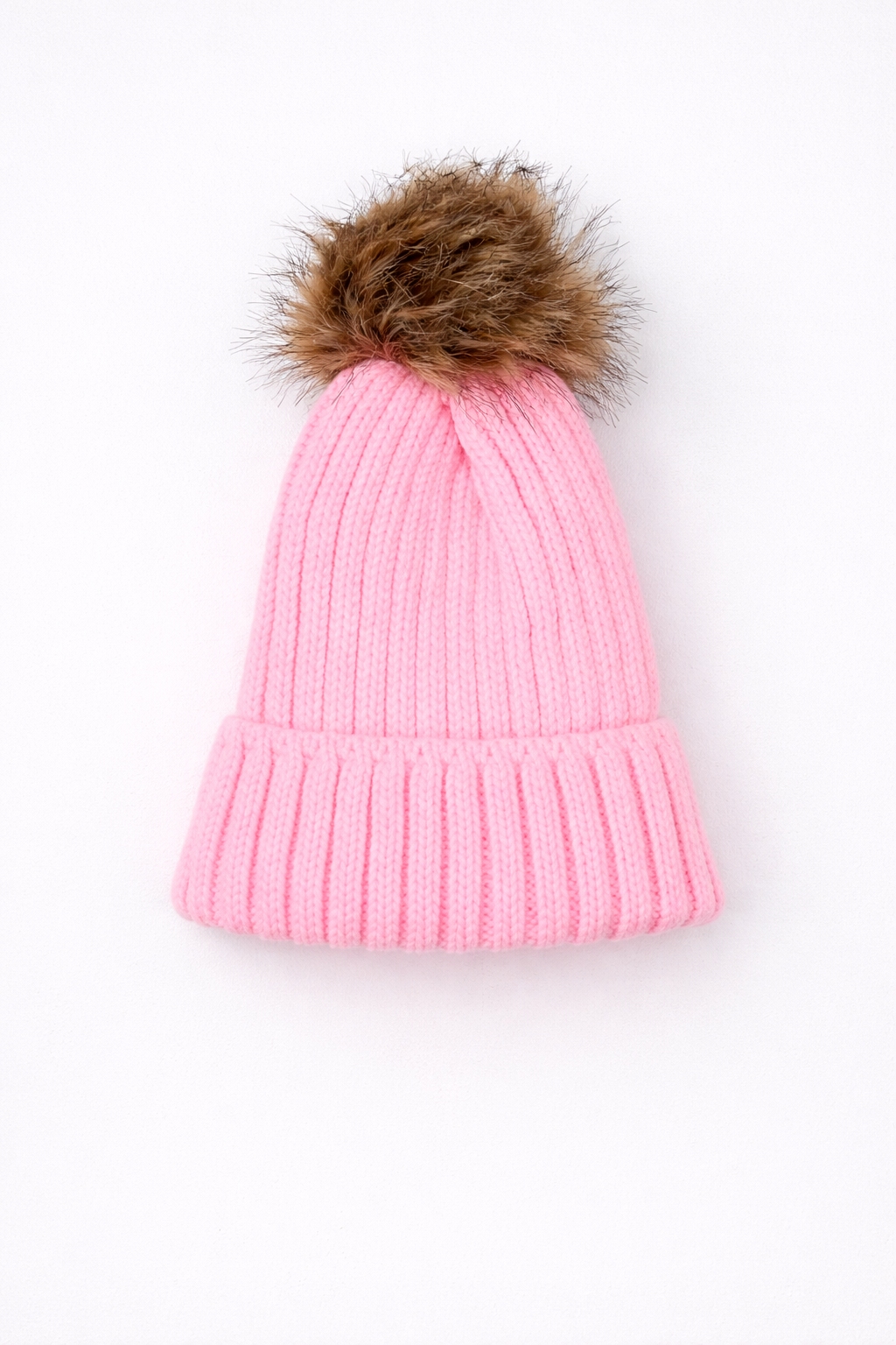 - Căciulă tricotată reiat cu fir moale din amestec de bumbac, cu pampon din fibre artificiale in partea de sus, cu margine răsfrântă la tiv.