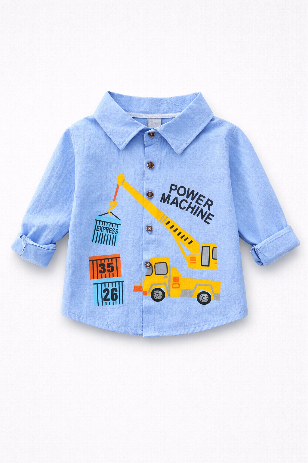 - Camasă bleu cu maneci lungi, din țesatură subtire de bumbac. Cu imprimeu masinute, nasturi de sus pana jos si guler rasucit. Cu mansete fara nasturi.