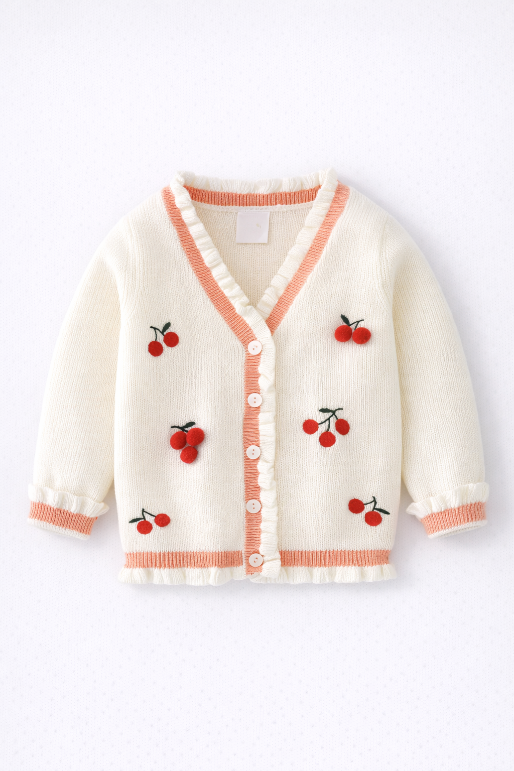 - Cardigan tricotat cu volane si cirese, din bumbac moale moale și flaușat la interior, cu croiala normala si lungime medie. Cu mâneci lungi, decolteu in V si nasturi asortati de sus pana jos. Bordură reiată la manșete și la bază. Din bumbac 100%.