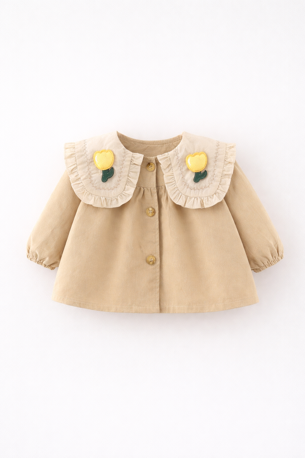 - Trenci bej pentru fetite, cu flori si guler brodat, din țesătură de bumbac 80% si poliester 20%. Cu nasturi de sus pana jos, maneci lungi cu borduri elastice la incheieturi. Cu guler rasucit cu volane si doua lalele aplicate si captuseala de poliester.