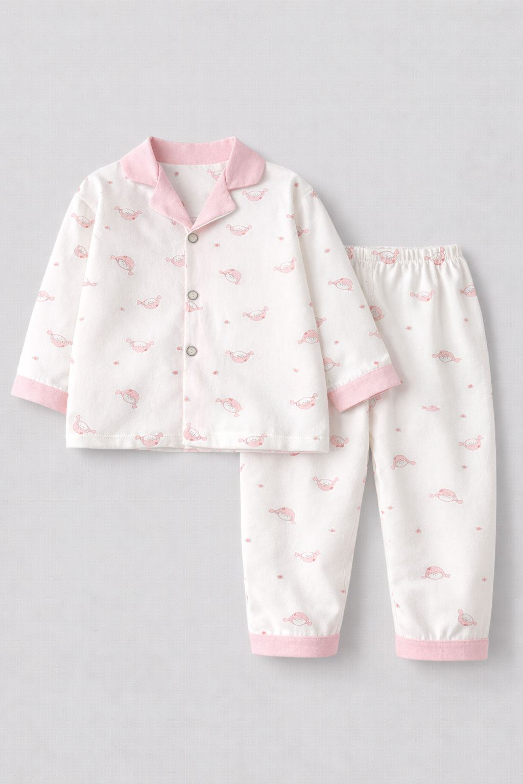 - Pijama cu cămașă și pantaloni, din jerseu moale de bumbac cu imprimeu, cu bordură cu picouri. Cămașă cu guler rotunjit, nasturi în față și mâneci lungi. Pantaloni subtiri cu elastic în talie si bordură contrastantă tiv.