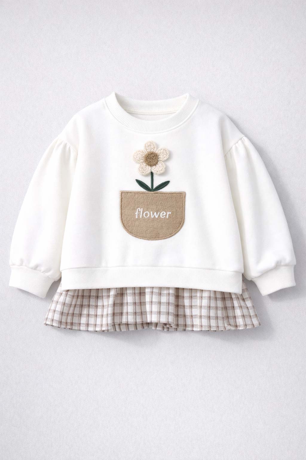 - Pulover alb cu broderie florala decorativa, din molton moale de bumbac. Cu insertie de volanas de culoare contrastanta, din bumbac subtire in carouri, borduri reiate la rascroiala gatului si la mansete.
