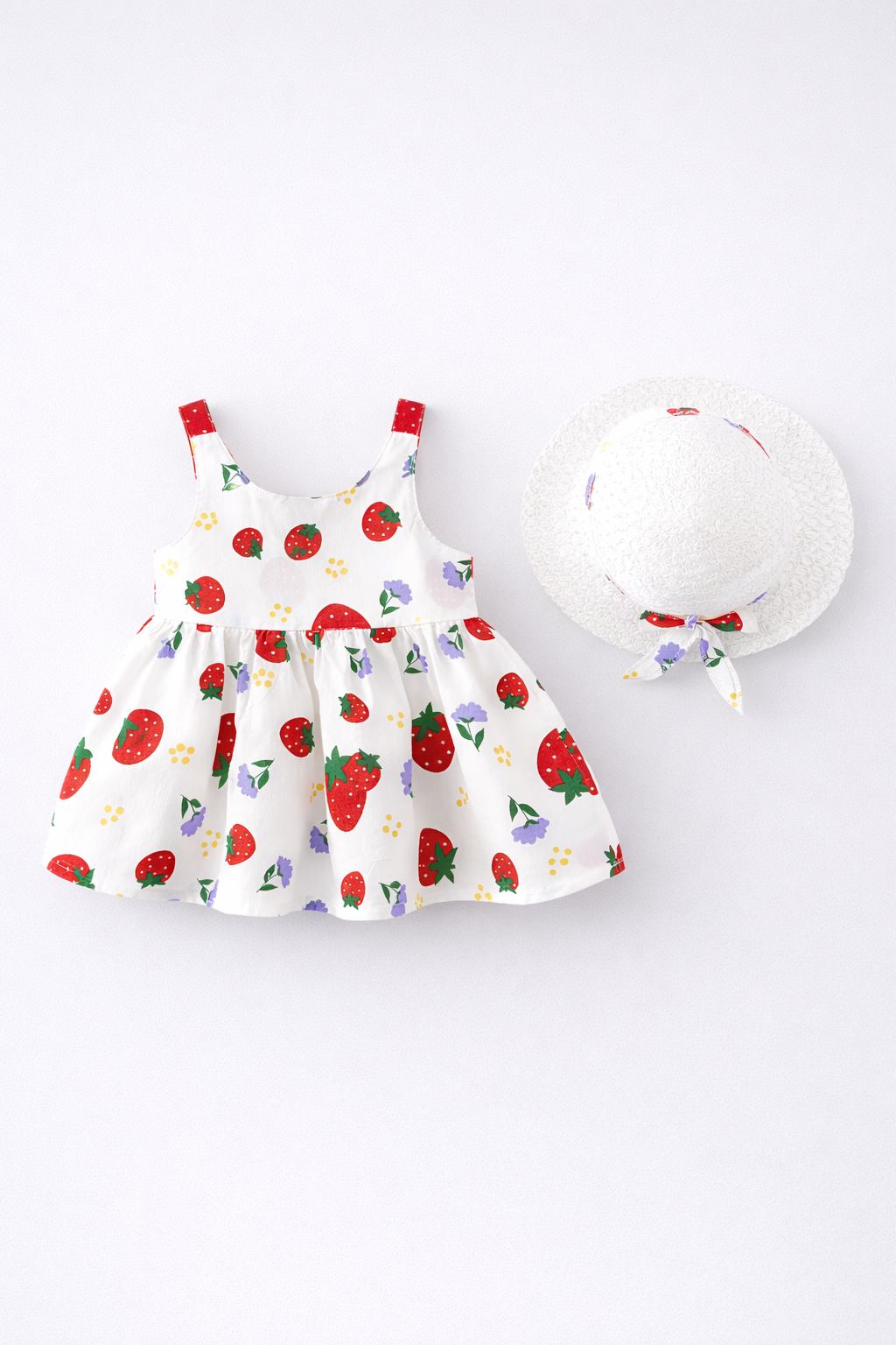 - Rochie de vara cu capsuni si palarie. Vaporoasa, cu croiala lejera si decolteu rotund. Cu imprimeu integral cu capsuni si palarie asortata. Din bumbac 100%.