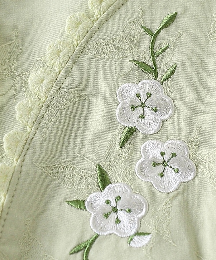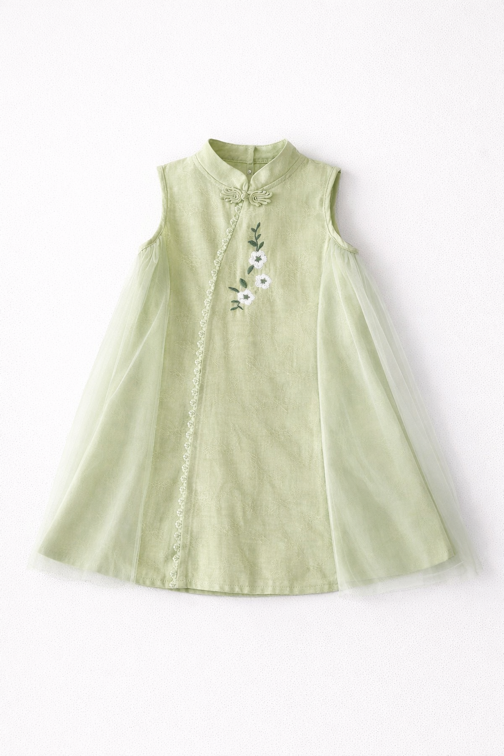 - Rochie fara maneci, lunga pana la genunchi, cu tul in laterale, cu flori brodate in fata, guler ridicat si inchidere cu fermoar la spate. Rochie verde lejera de vara pentru fetite.