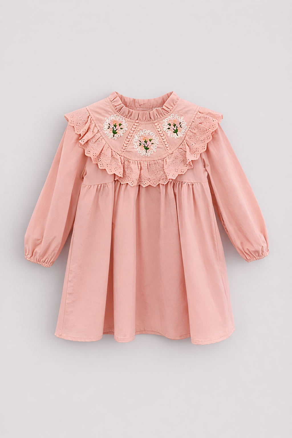 - Rochie lunga, cu croiala lejera, in stil retro, cu croiala lejera din bumbac. Lunga peste genunchi, cu broderie pe suprafata pieptului. Maneci lungi cu elastic imbracat la mansete si inchidere cu nasture la spate.
