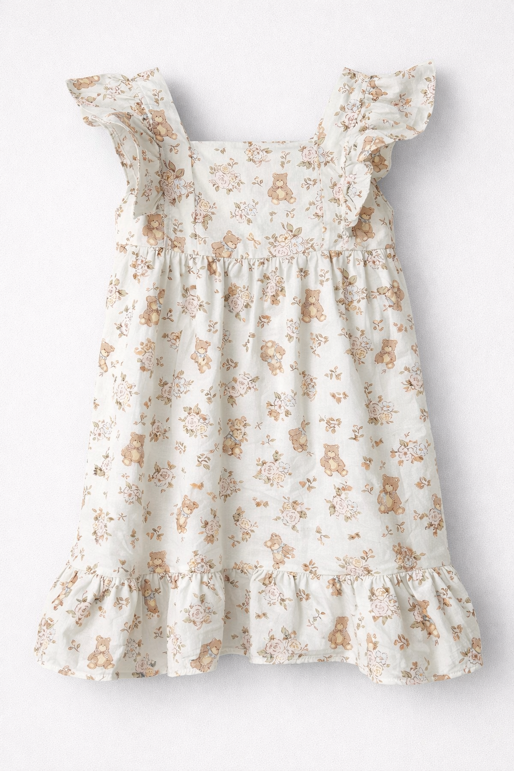 - Rochita cu flori si volane pentru fetite, cu croiala lejera, din tesatura subtire de bumbac. Cu nasturi la spate si imprimeu floral cu ursuleti pe toata suprafata.