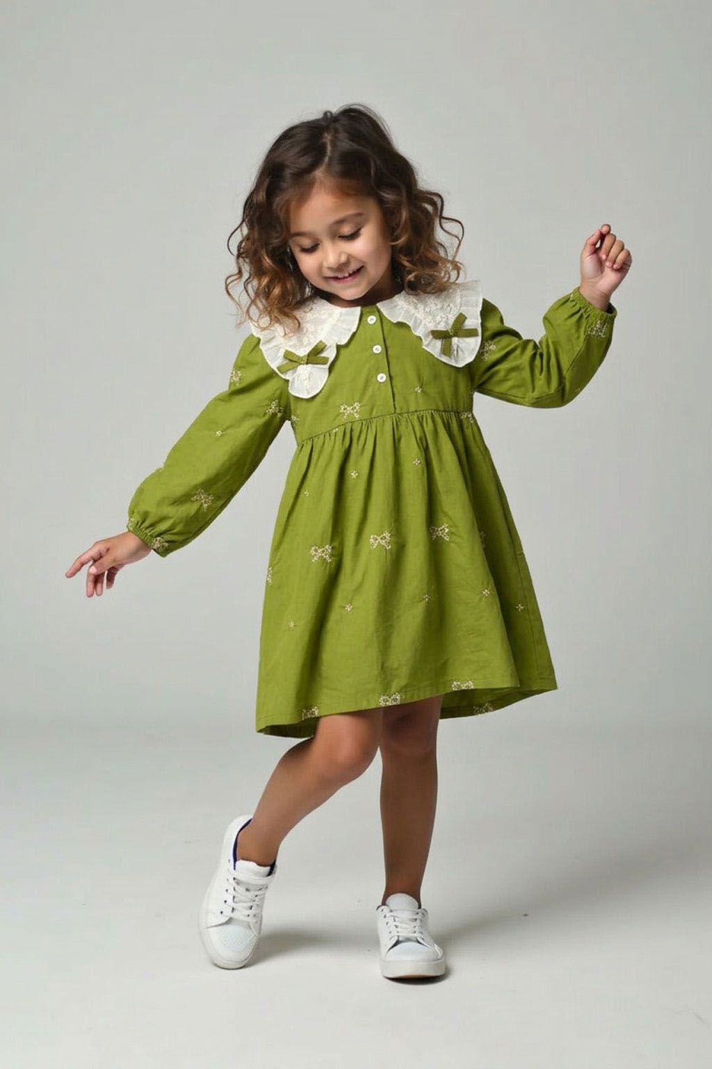 - Rochie verde lunga in stil retro – chic, cu croiala lejera, din bumbac cu fundite brodate pe toata suprafata. Lunga peste genunchi, cu guler amplu cu broderie si fundite. Cu maneci lungi bufante la umeri, elastic incretit la mansete si inchidere cu nasturi in fata. Necaptusita.
