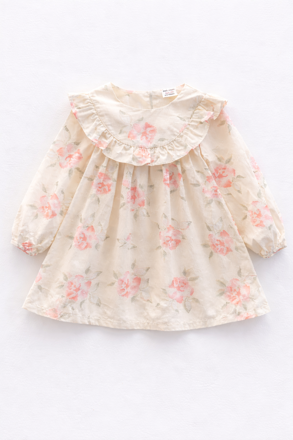 - Rochie de primavara cu croiala lejera si volane, din bumbac 95%. Lunga peste genunchi, cu volane la piept si imprimeu floral pe intreaga suprafata. Maneci lungi cu elastic incretit la mansete, decolteu rotund si inchidere cu nasture la rascroiala gatului la spate. Cu fusta usor evazata.