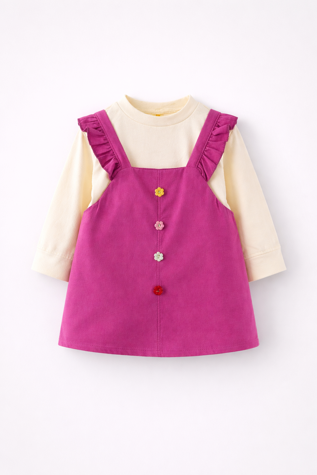 - Rochita casual pentru fetite din tesatura de bumbac. Cu bretele cu volane, nasturi decorativi de sus pana jos si bluza din jerseu moale cu maneci acoperite cu tul.