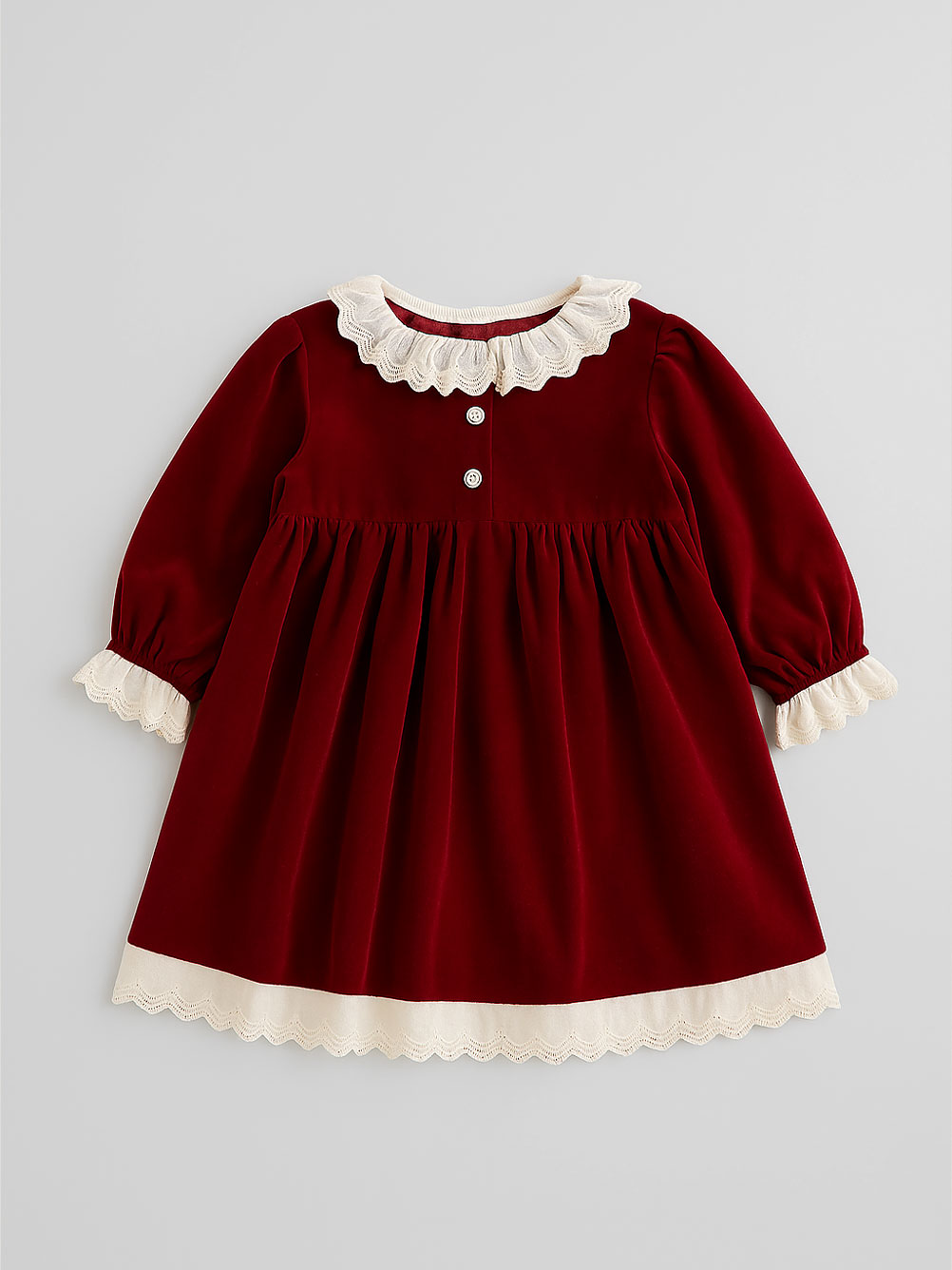 - Rochie rosie eleganta de catifea in stil retro – chic cu croiala lejera. Cu umeri bufanti, lunga peste genunchi, cu guler brodat de culoare contrastanta si maneci lungi cu elastic subtire la mansete. Cusatura incretita in talie. Necaptusita. Rochita pentru fetite de culoare rosu inchis, din bumbac 80 % si poliester 20%. Materialul nu este elastic.