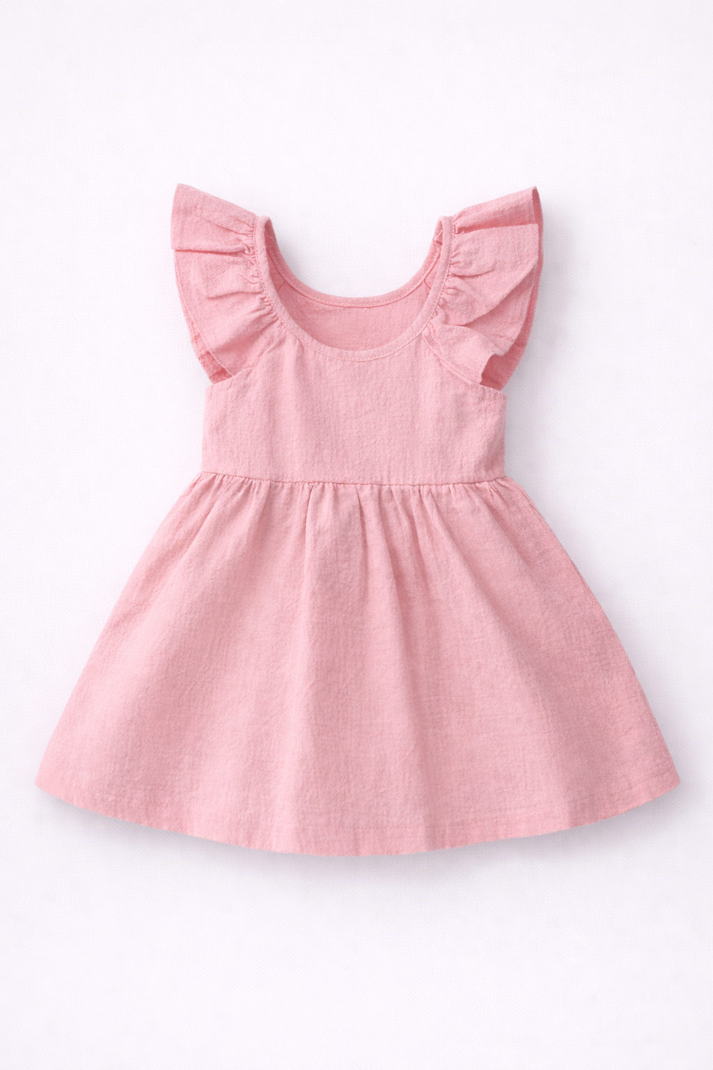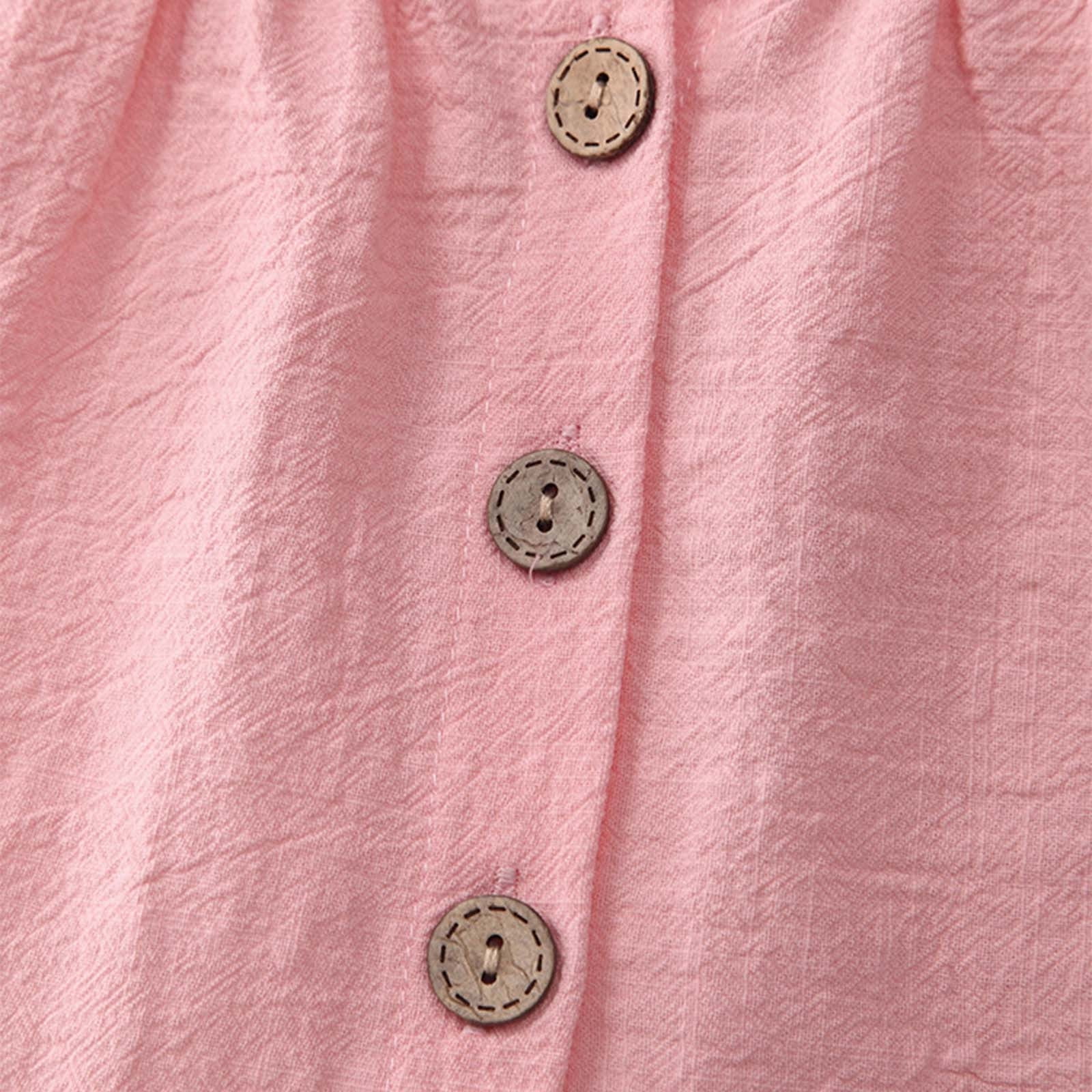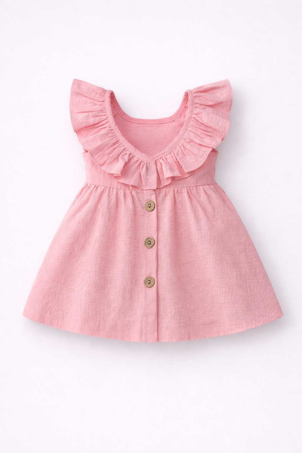 - Rochie roz fară mâneci, cu croială lejeră, decolteu rotund si volane la umeri. Inchidere cu nasturi la spate. Model plisat partial. Din bumbac 100%.