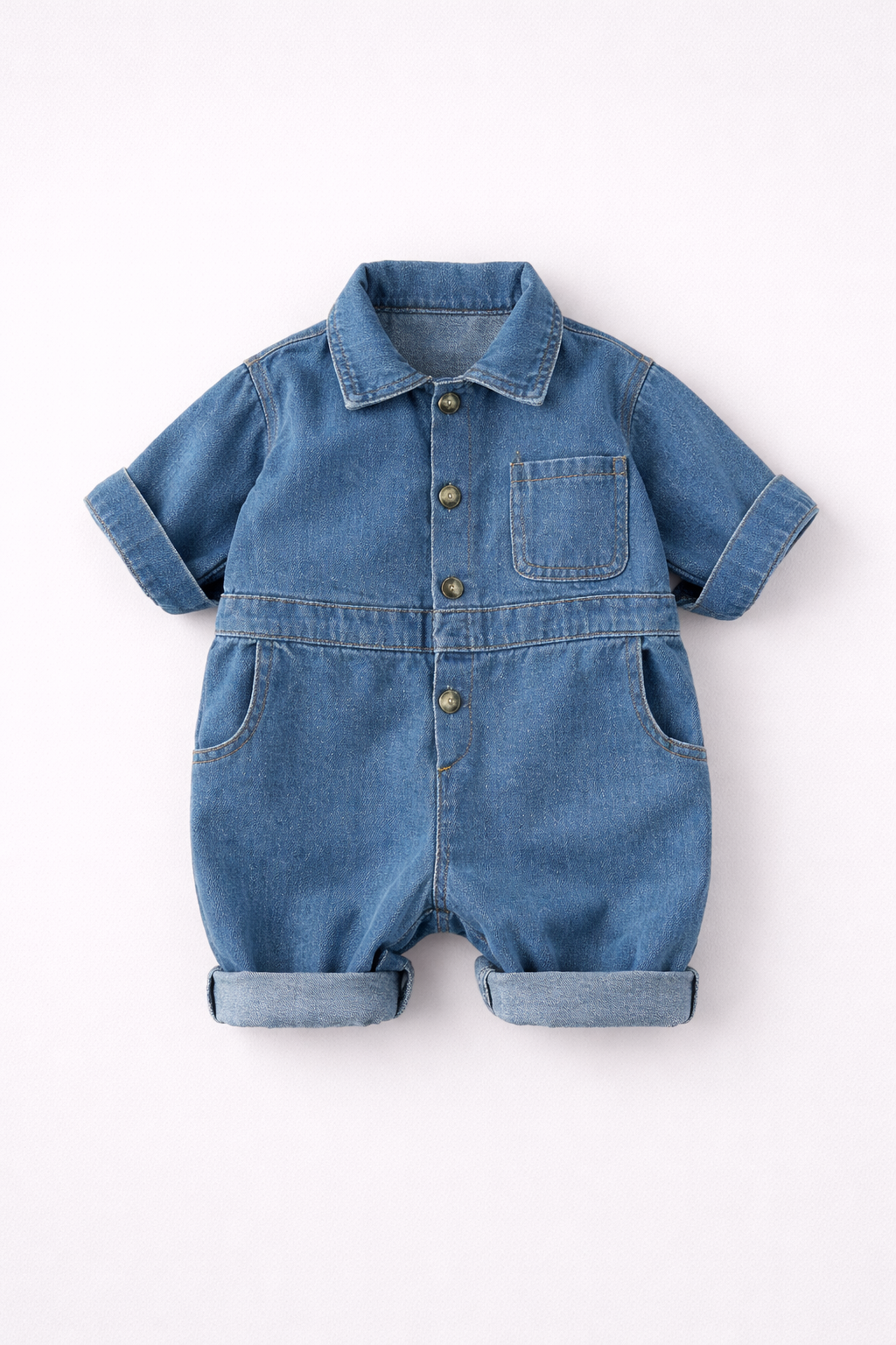- Salopeta lejera pentru bebelusi cu croiala lejera, din denim gros de bumbac 100%. Cu crac larg, nasturi de sus pana jos si guler rasucit tip camasa. Cu doua buzunare laterale, doua in spate si unul la piept.