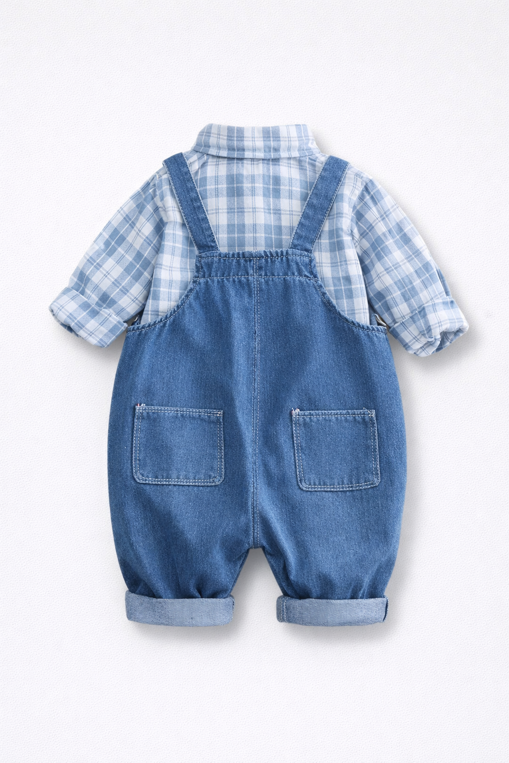 - Set cu camasa si salopeta de blugi, din bumbac. Camasa cu maneci lungi si nasturi de sus pana jos. Pantaloni lungi din denim, cu bretele reglabile nedetasabile, un buzunar in partea din fata si doua in spate.