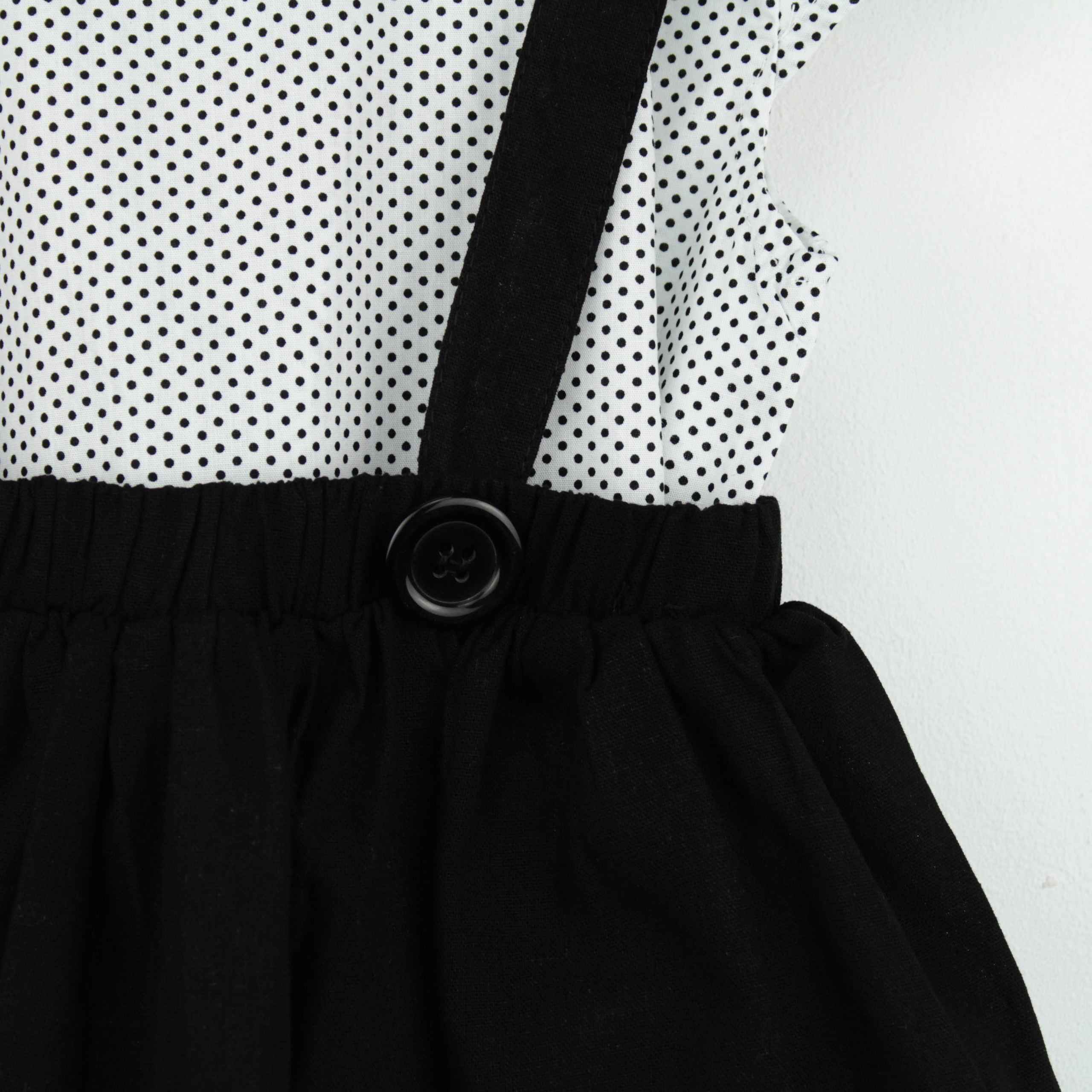 - Set compus din doua piese versatile, din tesatura de bumbac 100%. Camasa cu buline, cu lungime normala, fara maneci, cu volane, cu cordon la rascroiala gatului, nasturi de sus pana jos si guler rasucit. Fusta evazata neagra cu bretele reglabile, nedetasabile si nasturi decorativi.