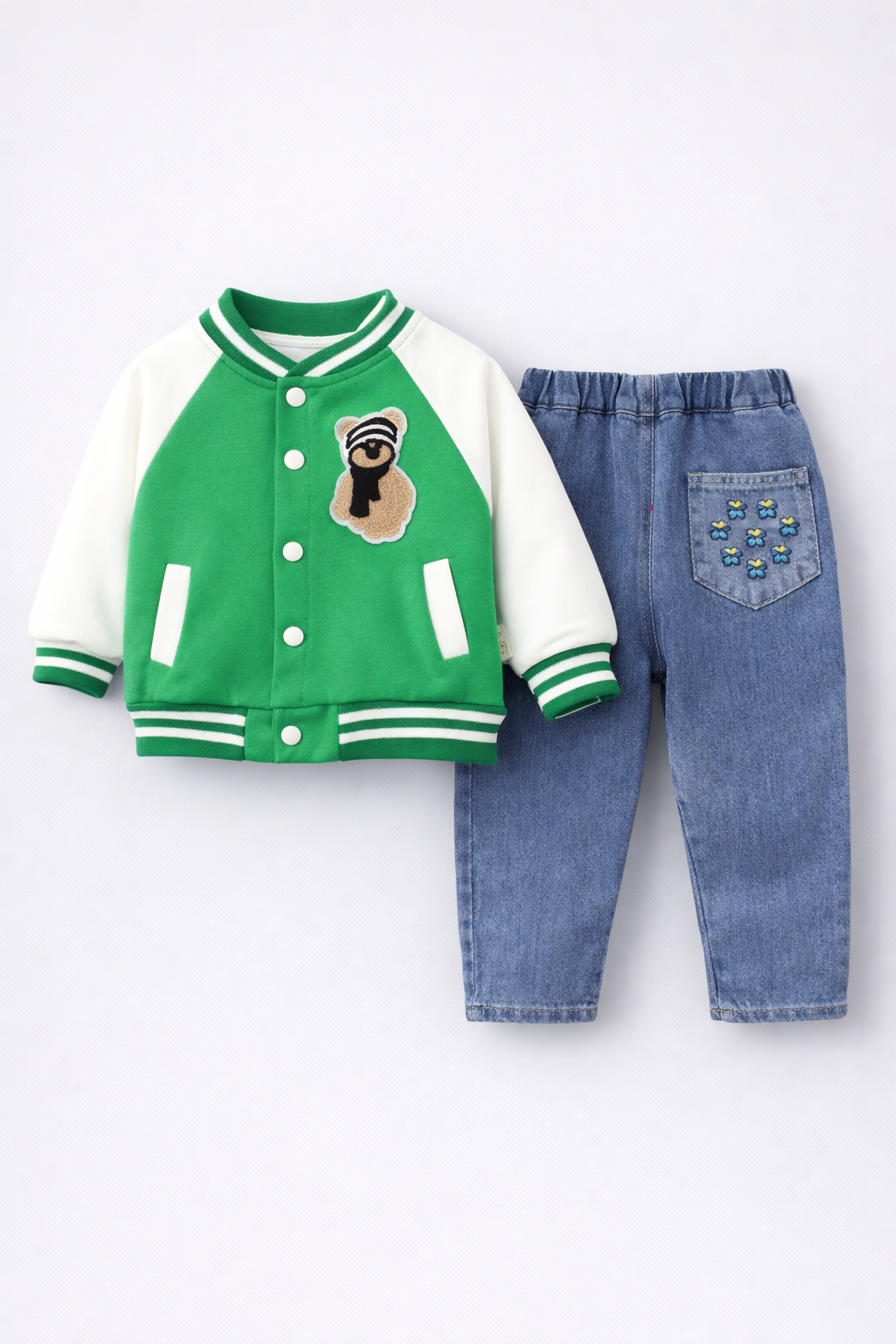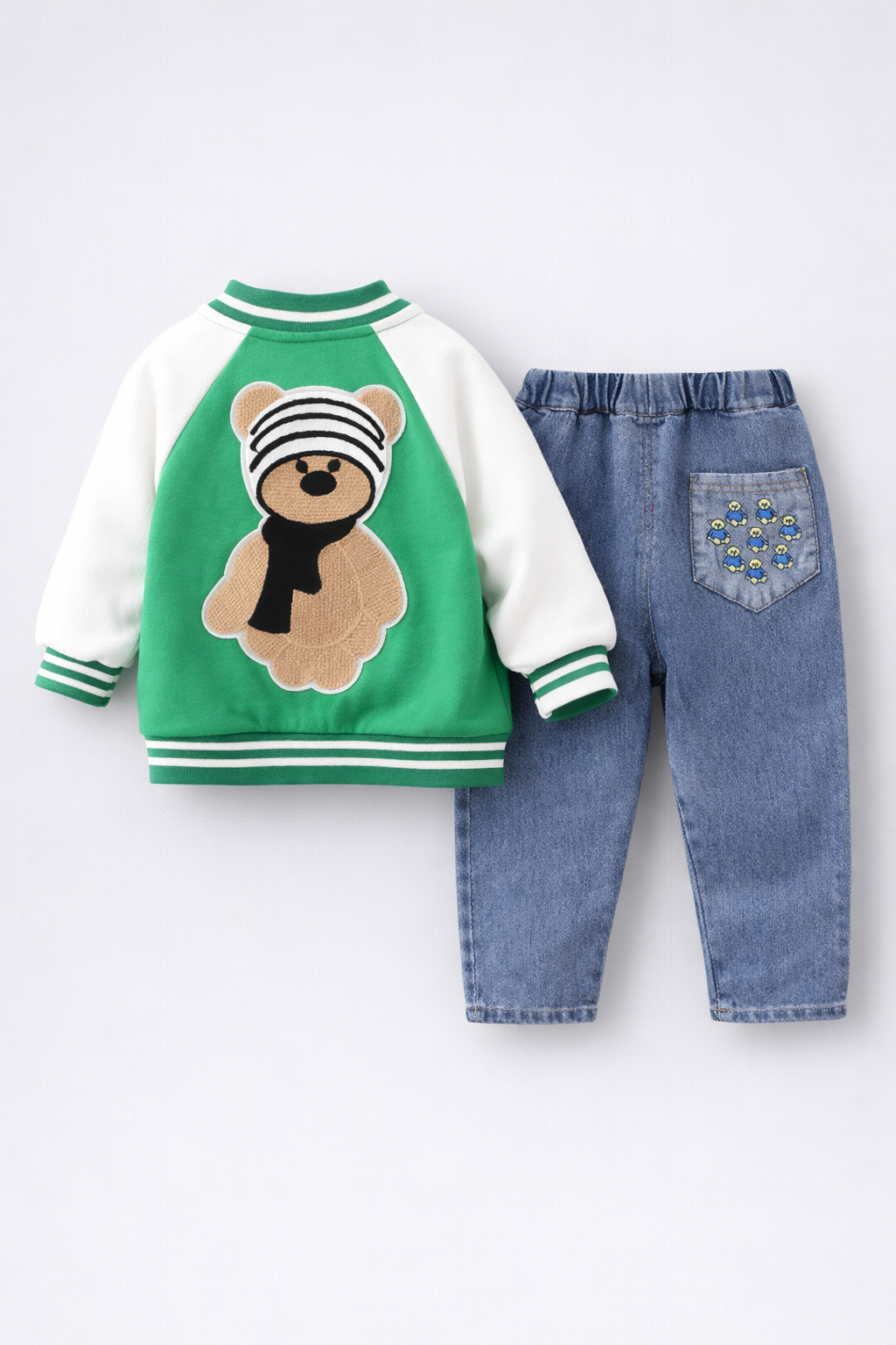 - Setul din amestec de bumbac cu 3 piese. Jacheta texturata cu bordura elastica reiata la baza si la mansete, cu capse de sus pana jos. Bluza alba de corp din jerseu de bumbac, cu maneca lunga si imprimeu. Pantaloni din denim din amestec de bumbac cu elastic incretit in talie
