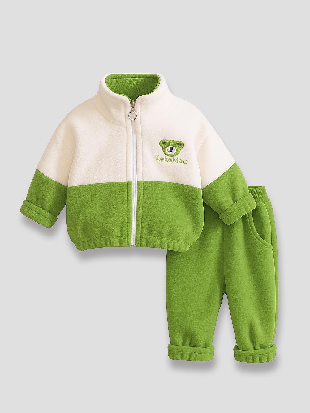 - Trening de iarnă din pluș, cu jachetă și pantaloni, confecționat din pluș moale de bumbac. Jachetă cu guler ridicat, cu fermoar în față și mâneci lungi. Pantaloni tip jogging cu doua buzunare laterale în față și elastic îmbrăcat în talie.